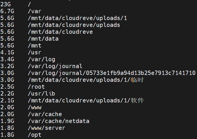 sudo du -h --exclude=/mnt / | sort -rh | head -n 20 |