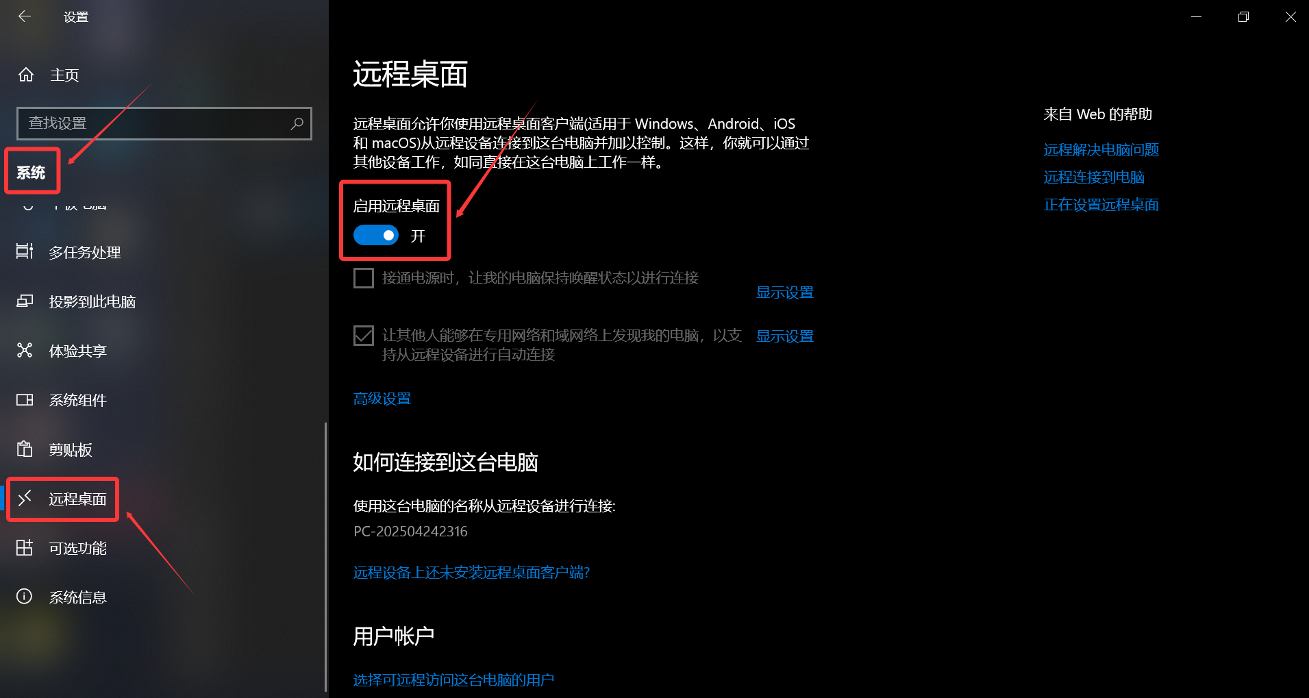 3、启用远程桌面功能:“设置” -> “系统” -> “远程桌面”