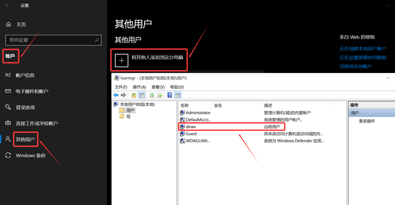 5、或者你可以直接创建拥有管理员权限的账户,管理员权限的账户自动可以被远程访问