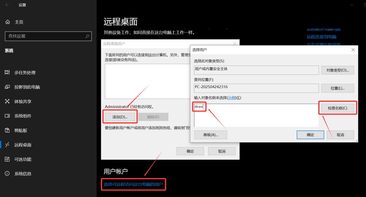 然后回到开启远程桌面设置的地方,点击 “选择可远程访问这台电脑的用户” -> “添加” -> 输入名字 -> “检查名称” -> 确定