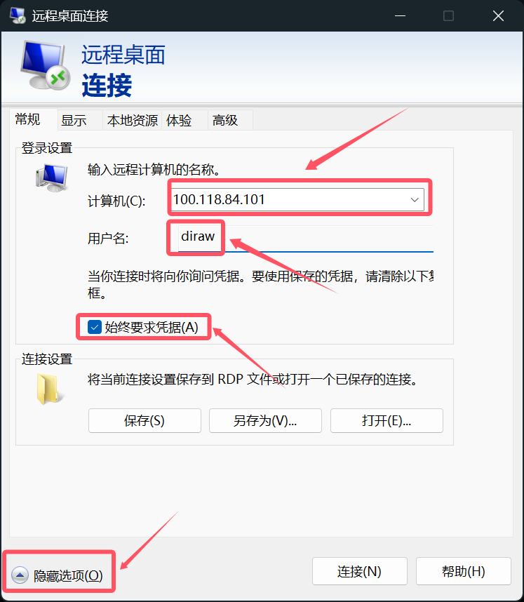 搜索 “远程桌面连接” -> 输入内网ip -> “显示选项” -> 勾选“始终要求凭据” -> 输入用户名 -> 连接